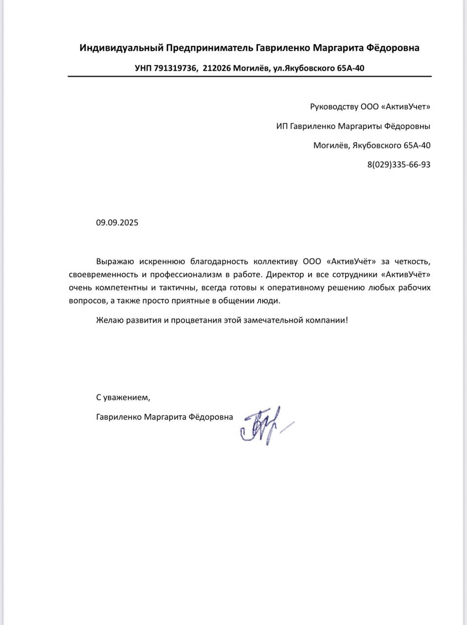 Благодарим лично Вас, Юлия Григорьевна, и всю команду ООО “АктивУчет” за щепетильное ведение дел, погружение в бизнес процесс, внимательное отношение к клиенту, экономию нашего времени и ресурсов. Рады, что когда-то остановили свой выбор именно на вашей компании. Желаем ООО “АктивУчет” удачи и дальнейшего развития.
